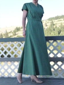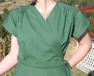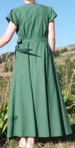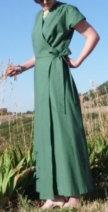 I found this a very easy pattern to work with and my only regret is that I made it a tad too big but at least that will give me lots of ease. I love the wrap style and it is very easy to put on. I think next time I will make it in a cute print with little flowers and do the housedress instead. That is in the future of course! 🙂