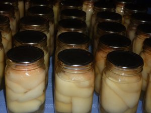 After canning 30 quarts of pears for the first time, at least the first time I wasn’t just helping my Mum or sister, I have a lot more appreciation for what my sister does each year making all those pints and quarts of jams, jellies, fruits, mincemeat…. It was quite a task but I enjoyed it very much! The satisfaction of having completed a project makes it well worth the effort. I shall now attempt to can more than six jars of applesauce, it was seven but number seven bit the dust and is now no more. *sigh* I was rather hoping for a nice explosion while canning but alas, only a tiny clink as the bottom of one of the jars broke because I turned the heat up too fast. Disappointing to say the least!