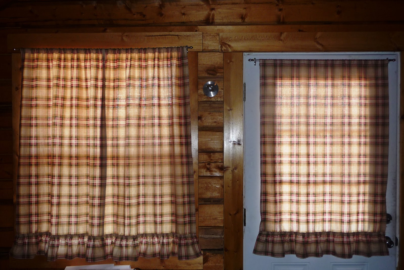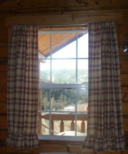 …curtains for the windows. I actually sewed these up before Roy was born and I’m only now getting around to posting pictures. For many months…lets just say a really long time, Jay had been asking me to get curtains for the windows in our little cabin because he didn’t want me being home alone and just anybody being able to walk up and look in the window. I kept trying and trying to get them cut out and sewn up but something always came up, I’d plan a day to work on them and I wouldn’t feel well or I needed to clean the very messy house (its amazing how dirty such a small place can get in such a little amount of time.) and curtains were down lower on the list than dishes and so on and so forth. Anyways…finally I just made time and after scrubbing the cabin floor I laid out the fabric and carefully measured out sections and they came out too short for the windows :-0….so, after debating it and trying many different things, I finally tried doing ruffles along the bottom and I think they turned out very nicely. No pattern was used, just lots of measuring and careful sewing! 🙂 (It took me over an hour which was a little depressing since curtains are such a simple thing one would think.;-)