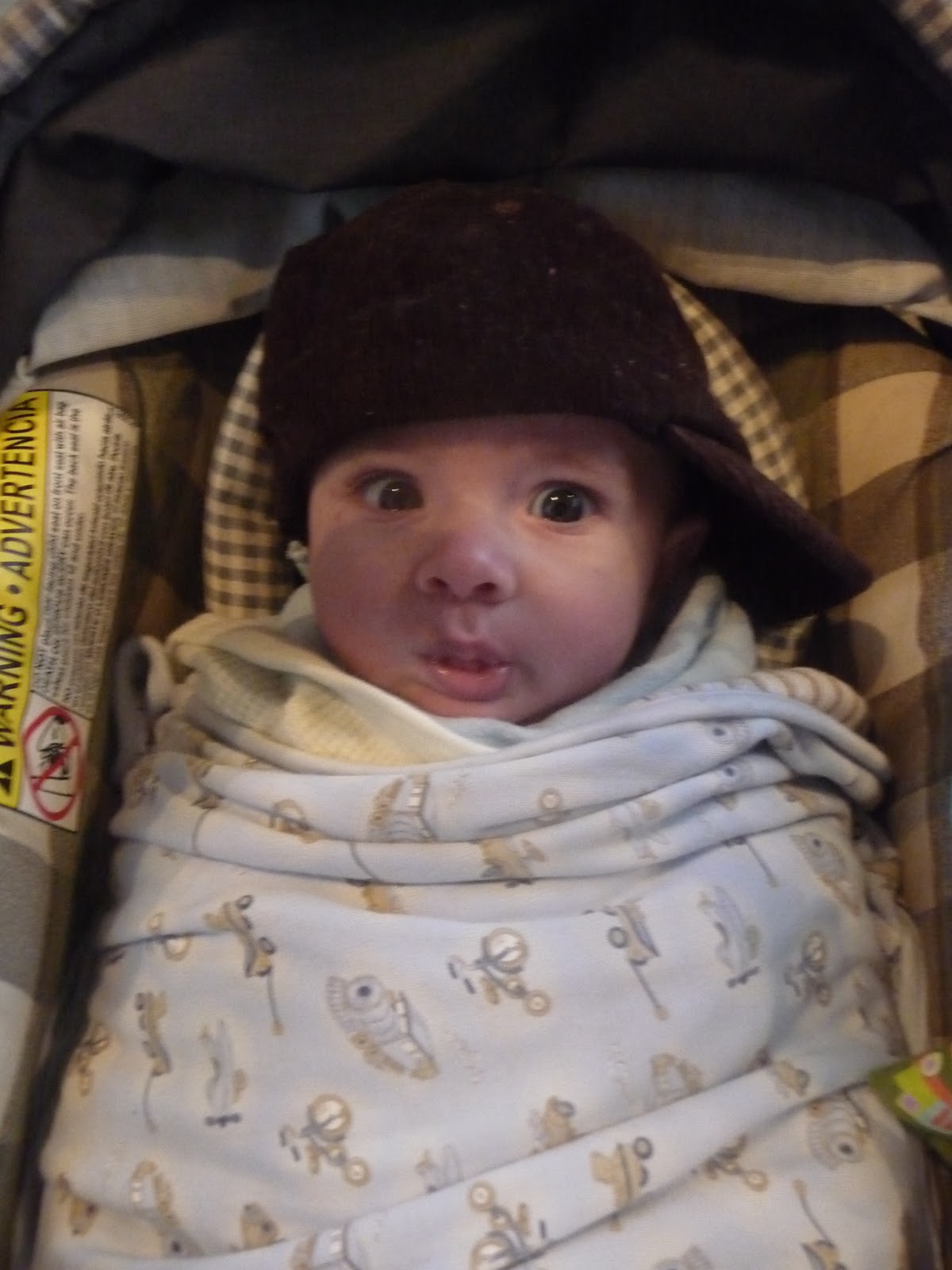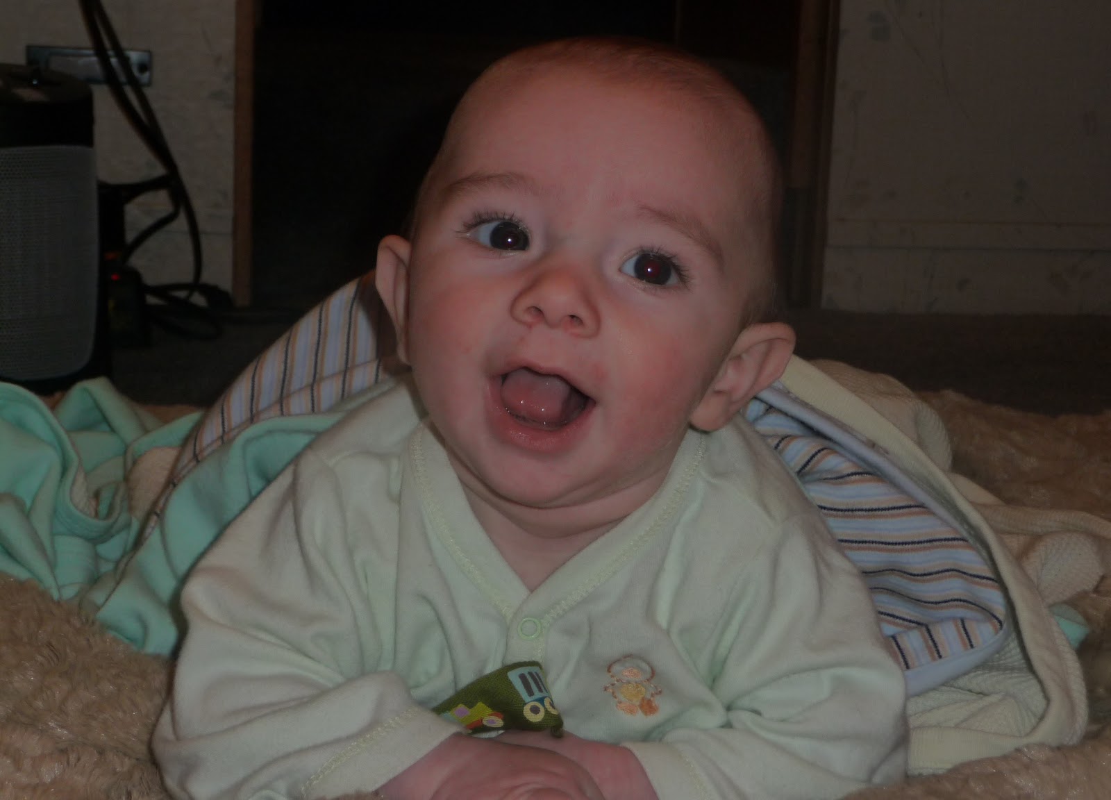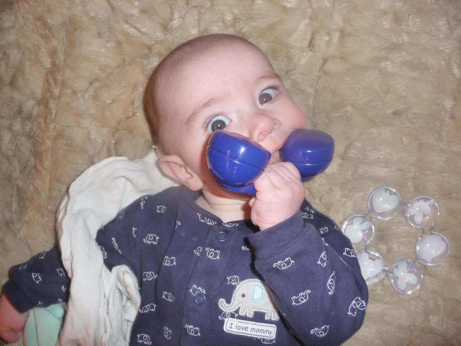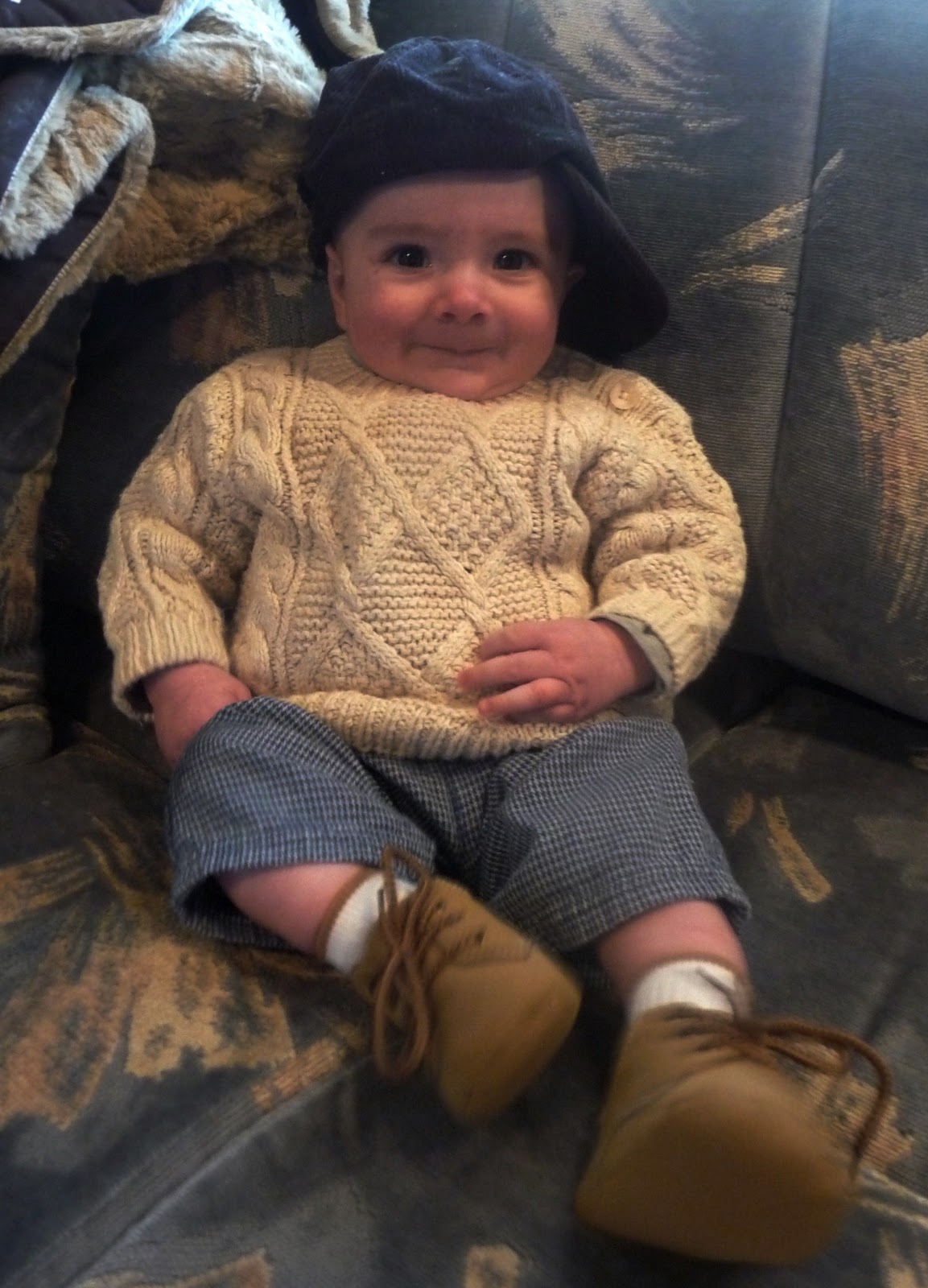 He prefers his hat on sideways so it doesn’t fall over his eyes, he gets quite distraught if he can’t see. (Its rather cute really but don’t tell him that! 😉 ) He has also started scooting around which is the beginning stage of crawling in my opinion. He definitely gets where he wants to go and we’re going to have to get baby gates soon I’m thinking. He has also started saying “ma-ma” when he wants something, I don’t think he’s figured out that I’m “Mama” yet but he has figured out that if he wants attention, it works much better than fussing. And that’s more than alright with me! 🙂