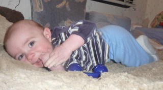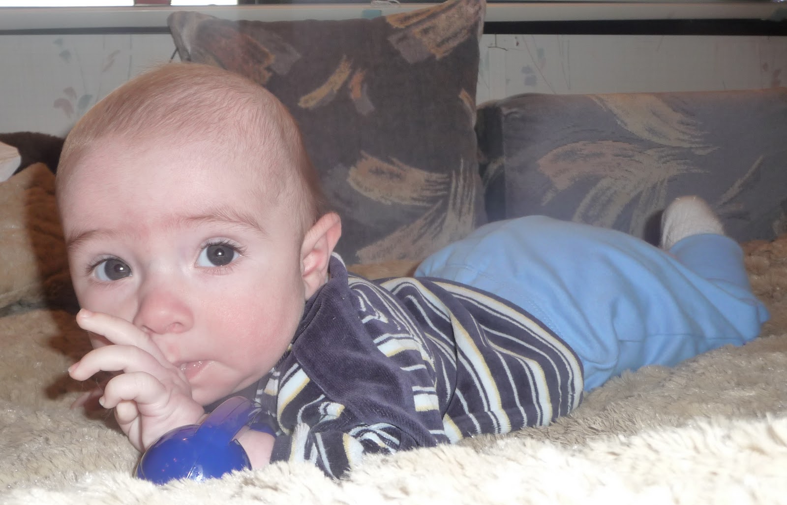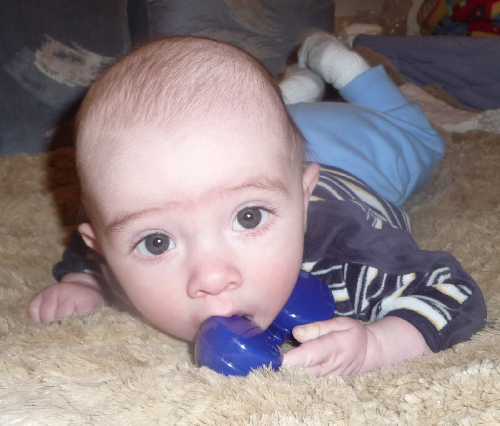 No teeth so far but he sure does like his fingers.