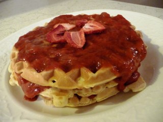 When the kitchen is messy, one is incredibly tired and definitely isn’t feeling like cleaning said kitchen or even thinking about cooking dinner and the husband just quietly steps in and makes dinner…..well, lets just say that I am one very lucky lady!!! But get this, not only did he make waffles from scratch and cook them, he also cooked down strawberries into a wonderful jam to spread on them. A-m-a-z-i-n-g.