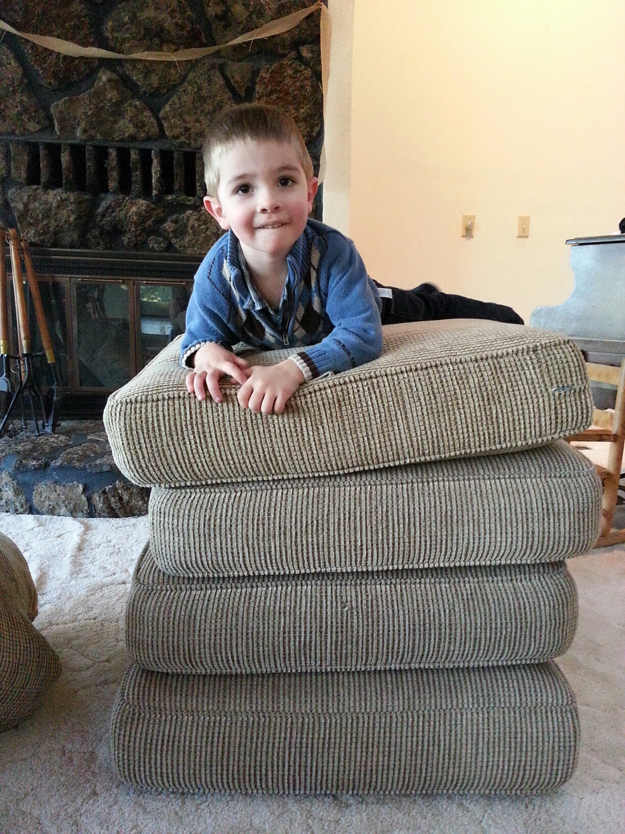 This little man is turning out so much like his Daddy! Not only does he have the same eyes and quiet smile but he already shows a bent towards building things! This is his creation for today and you can’t see it in the picture but behind this stack of cushions is another so he could bounce on that to get on top of the higher stack. Very clever little man I must say! Its going to be so much fun watching him grow into a young man!